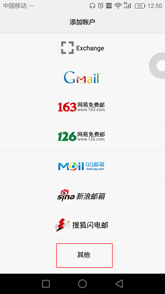 在电子邮件客户端中选择邮件提供商“其它”,输入完整的地址、密码后点击手动设置。